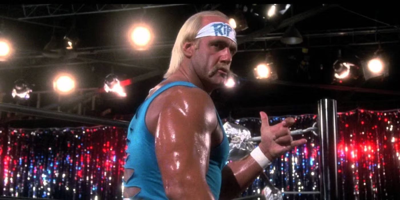 In the film, Hulk Hogan plays the world’s greatest wrestler, a bald-n-blonde man who tears his shirt off in the ring and has a symbiotic relationship with the crowd. He’s Hulk Hogan in all but name. The character’s actual name is Rip, which is dumb, so we’ll just refer to him as Hulk Hogan. Which brings me to our first point of inquiry.