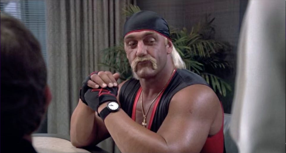 Other than Mean Gene Okerlund, who we sadly never see again, my favorite part of this movie is how Hulk Hogan goes through life dressed like he’s about to get into the ring. He's a trendsetter; athleisure is all the rage today but Hulk Hogan was there 35 years ago.