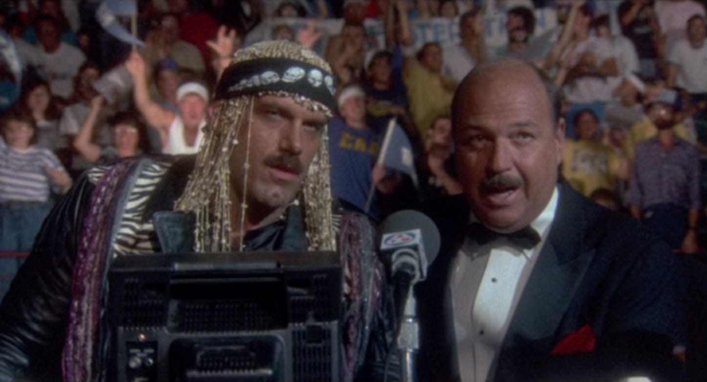 No Holds Barred actually starts pretty strong, and it has nothing to do with the movie itself. We’re thrown right into what feels like a WWF broadcast—look, I know it’s called the WWE now, but that’s stupid; it’s forever the WWF to me—as Mean Gene Okerlund himself sits ringside to call the fight.3 My initial reaction upon rewatch was, “Holy shit! They got Mean Gene in this movie!” Which nobody has probably ever said. But Mean Gene was the voice of my childhood, alongside Kermit the Frog, Mister Rogers, and Optimus Prime. That a nostalgia murderer’s row if I’ve ever seen one.