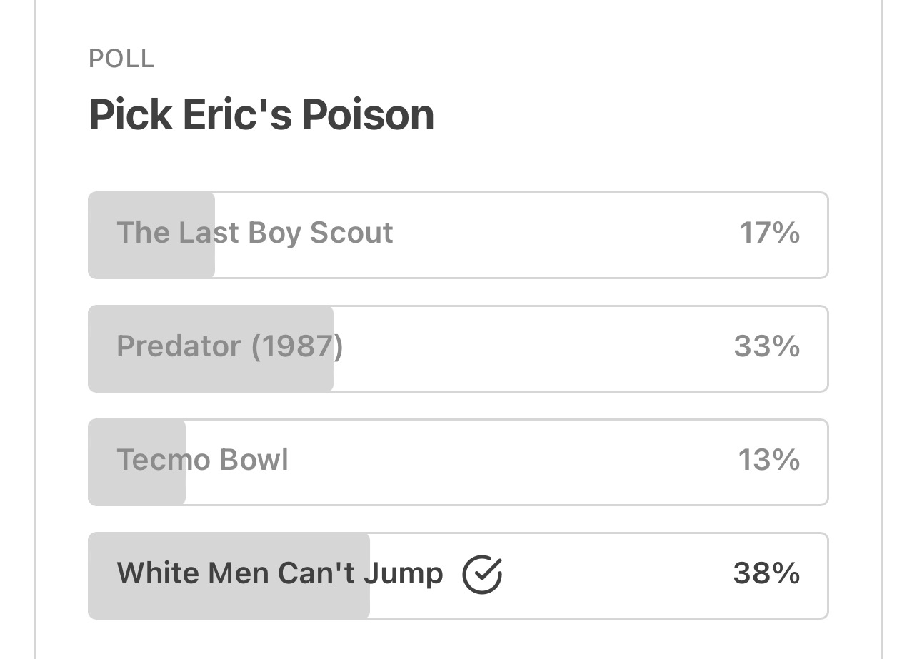 Totally unrelated—it takes more than weird butt stuff to get my muse out of bed—you can be sure Demolition Man is on a short list of films I’m considering writing on in the near future. Speaking of which! I recently dropped a poll requesting your guidance on my next project. It’s early days but I’m frankly shocked my autobiography is leading the vote.